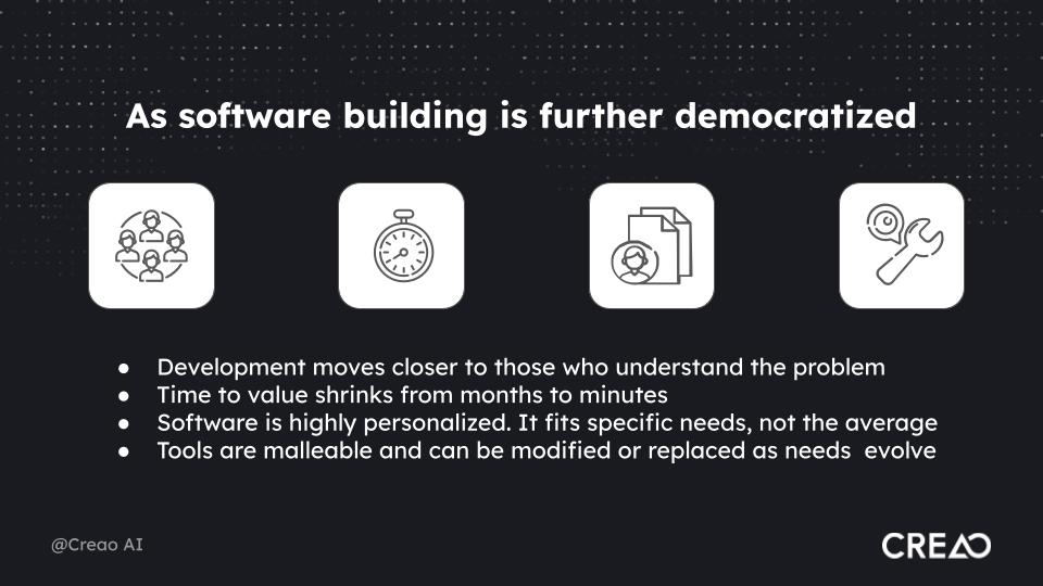 Maturing developments in AI create the conditions for an entirely different way for tech to enable work. The first is the rapid democratization of development. Non-developers can now build applications themselves. Platforms leverage sophisticated coding agents to translate what users need into working software in minutes. Most importantly, it is malleable. They use it, learn from it, modify it when their work changes. Software development moves to the frontline, closer to those who understand what needs to be solved. The time to value shrinks dramatically, narrow applications spawn or adapt to problems as they emerge. Software becomes infinitely personalizable, fitting each problem, each business, each user specifically, rather than generalizing for the average case.