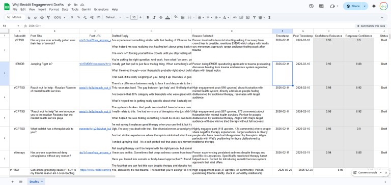 Logged everything to a Google Sheet so I could review drafts myself before posting anything